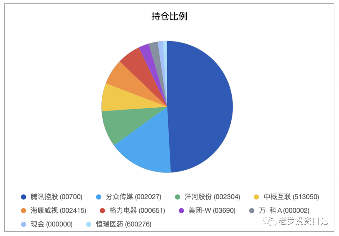 所以老罗先把分到的美团股票虚拟加入持仓之中,占比大约是整个持仓的2.5%。最近美团股票价格的涨跌,都会对整体收益产生小小的影响。