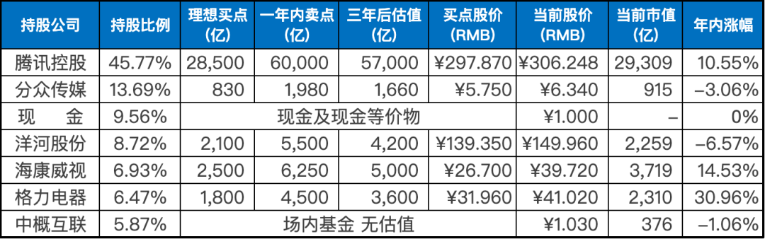目前持仓:腾讯控股45.77%,分众传媒13.69%,现金9.56%,洋河股份8.72%,海康微视6.93%,格力电器6.47%,中概互联5.87%。