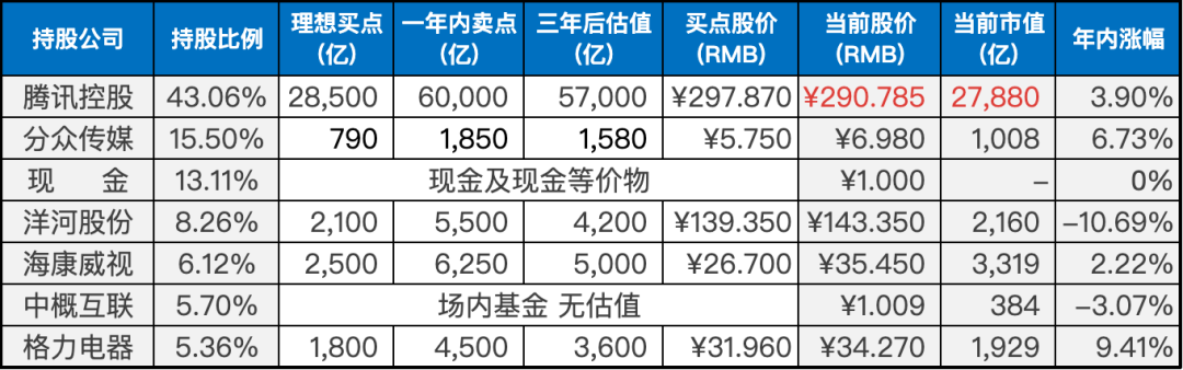 目前持仓:腾讯控股43.06%,分众传媒15.50%,现金13.11%,洋河股份8.26%,海康微视6.12%,中概互联5.70%,格力电器5.36%。