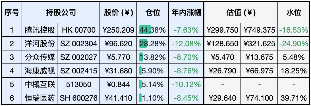 当前持有的股票包括:腾讯控股 45.36%、洋河股份 27.34%、分众传媒 13.78%、海康微视 5.82%、中概互联 5.29%、恒瑞医药 1.06%。