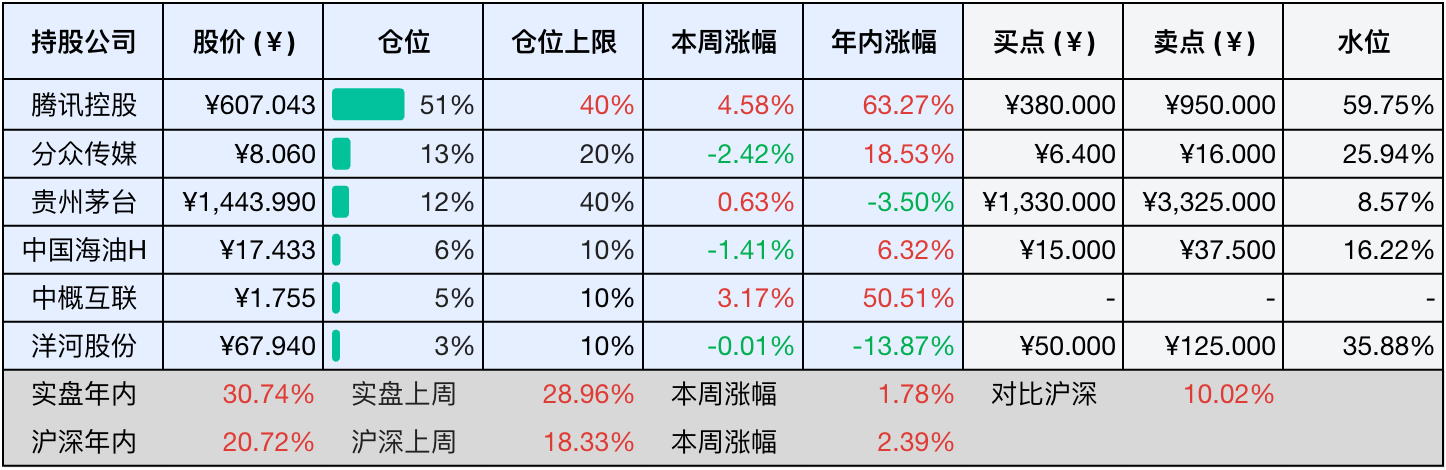 当前持有的股票包括:腾讯控股 51%、分众传媒 13%、贵州茅台 12%、中国海油H 6%、中概互联 5%、洋河股份 3%。