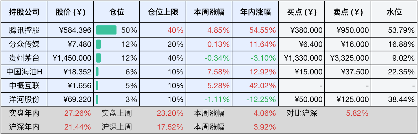 当前持有的股票包括:腾讯控股 50%、分众传媒 13%、贵州茅台 12%、中国海油H 6%、中概互联 5%、洋河股份 3%。