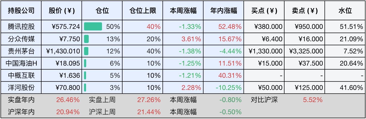 当前持有的股票包括:腾讯控股 50%、分众传媒 12%、贵州茅台 12%、中国海油H 6%、中概互联 5%、洋河股份 3%。