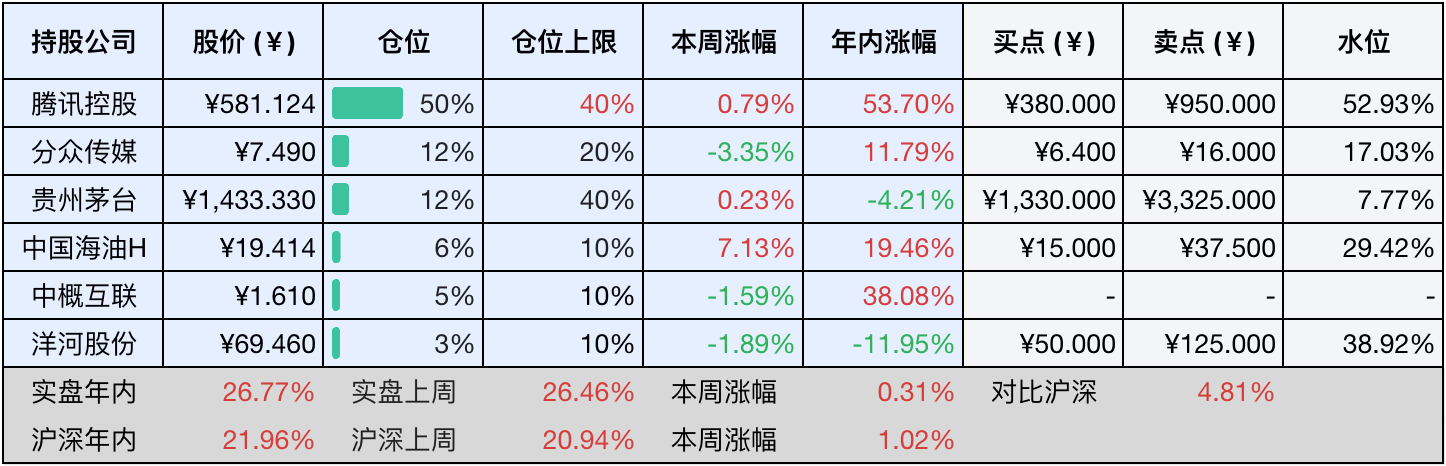 当前持有的股票包括:腾讯控股 50%、分众传媒 12%、贵州茅台 12%、中国海油H 7%、中概互联 4%、洋河股份 3%。