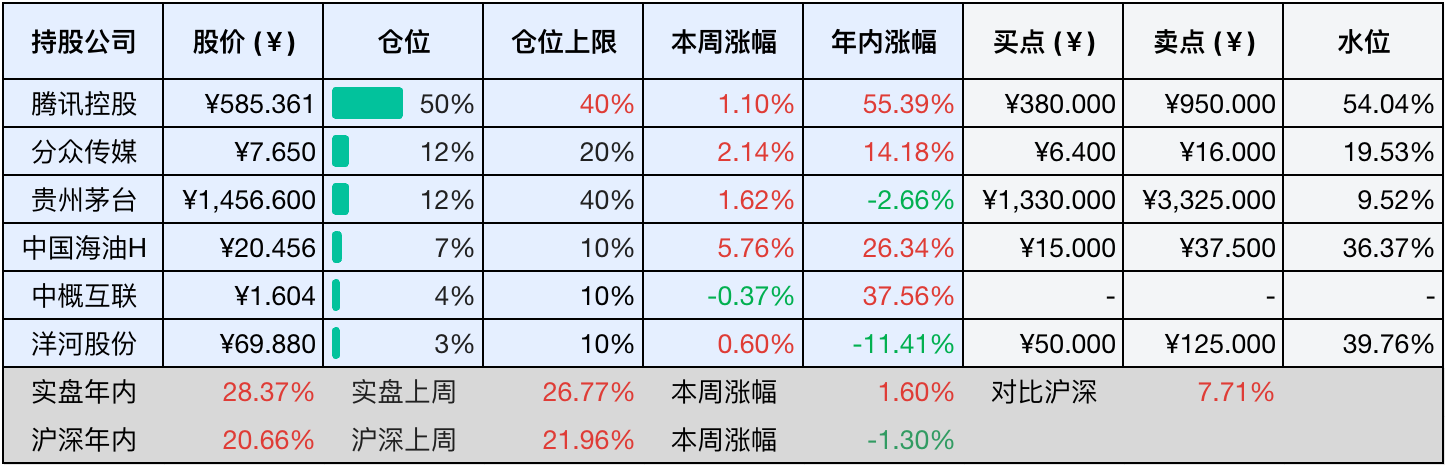当前持有的股票包括:腾讯控股 49%、分众传媒 13%、贵州茅台 12%、中国海油H 7%、中概互联 4%、洋河股份 3%。