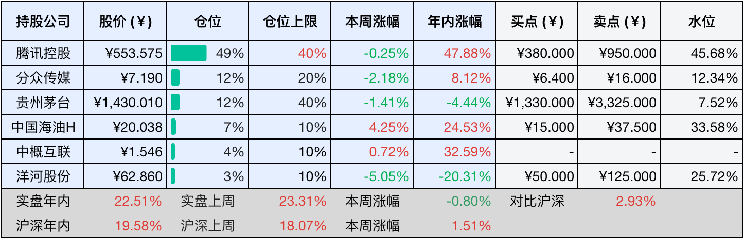 当前持有的股票包括:腾讯控股 49%、分众传媒 12%、贵州茅台 12%、中国海油H 7%、中概互联 4%、洋河股份 3%。