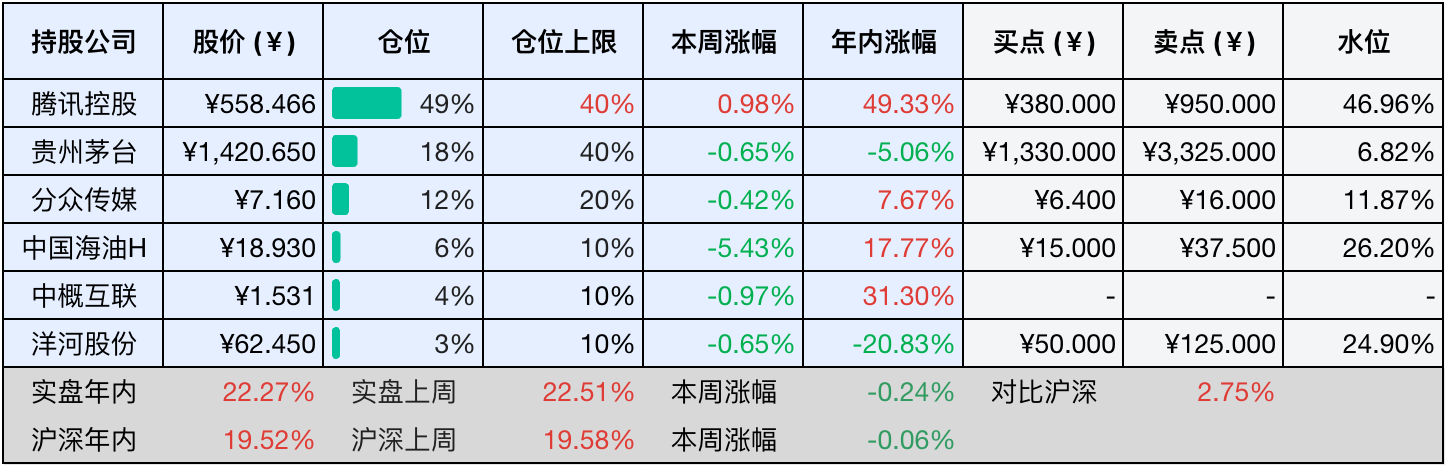 当前持有的股票包括:腾讯控股 49%、贵州茅台 18%、分众传媒 12%、中国海油H 6%、中概互联 4%、洋河股份 3%。