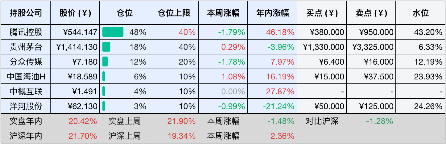 当前持有的股票包括:腾讯控股 48%、贵州茅台 18%、分众传媒 12%、中国海油H 6%、中概互联 4%、洋河股份 3%。