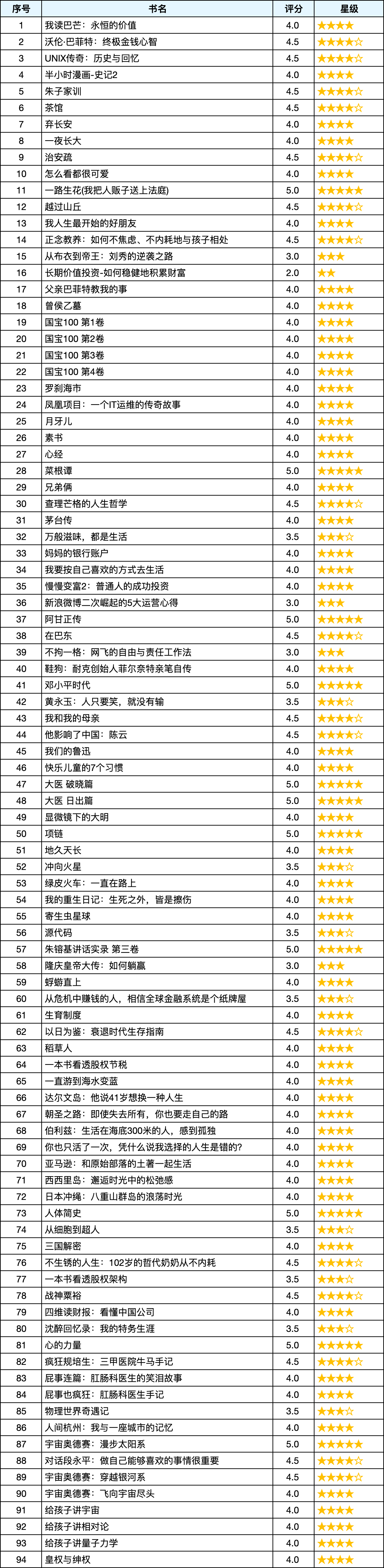 下表是全年书单明细,四星以上的书籍都是老罗觉得还不错的,值得一读。