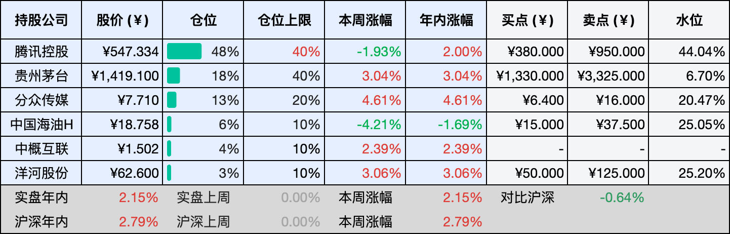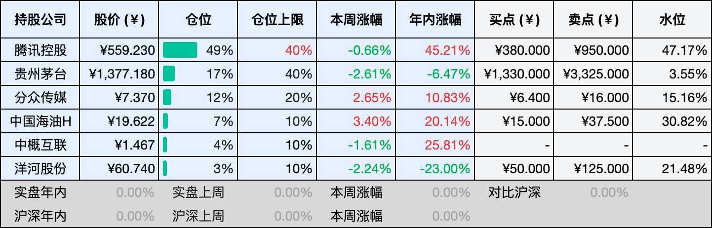 当前持有的股票包括:腾讯控股 48%、贵州茅台 18%、分众传媒 13%、中国海油H 6%、中概互联 4%、洋河股份 3%。