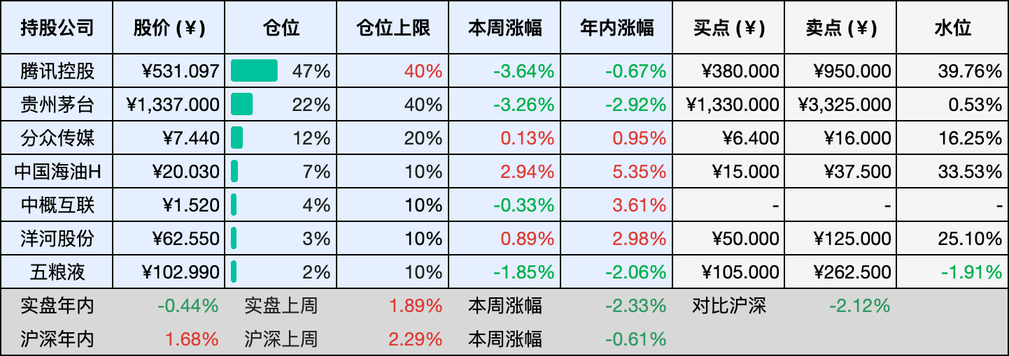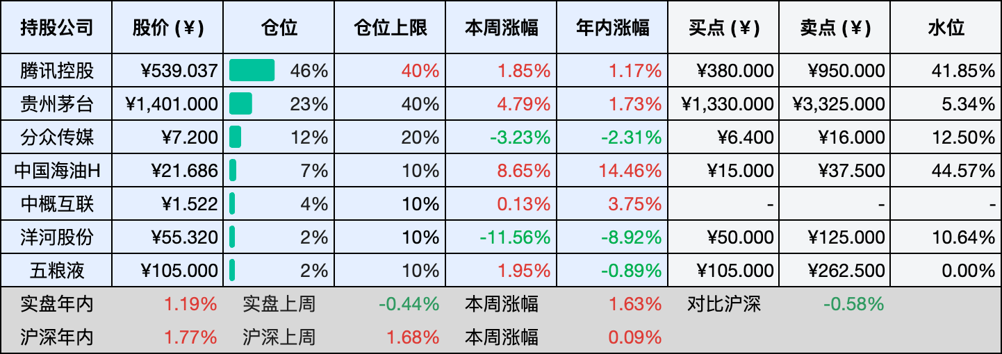 当前持有的股票包括:腾讯控股 46%、贵州茅台 23%、分众传媒 12%、中国海油H 7%、中概互联 4%、洋河股份 2%、五粮液 2%。