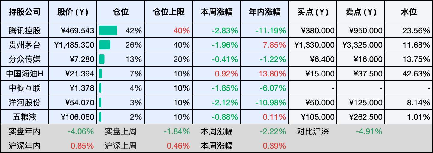 当前持有的股票包括:腾讯控股 42%、贵州茅台 26%、分众传媒 13%、中国海油H 7%、中概互联 4%、洋河股份 3%、五粮液 2%。