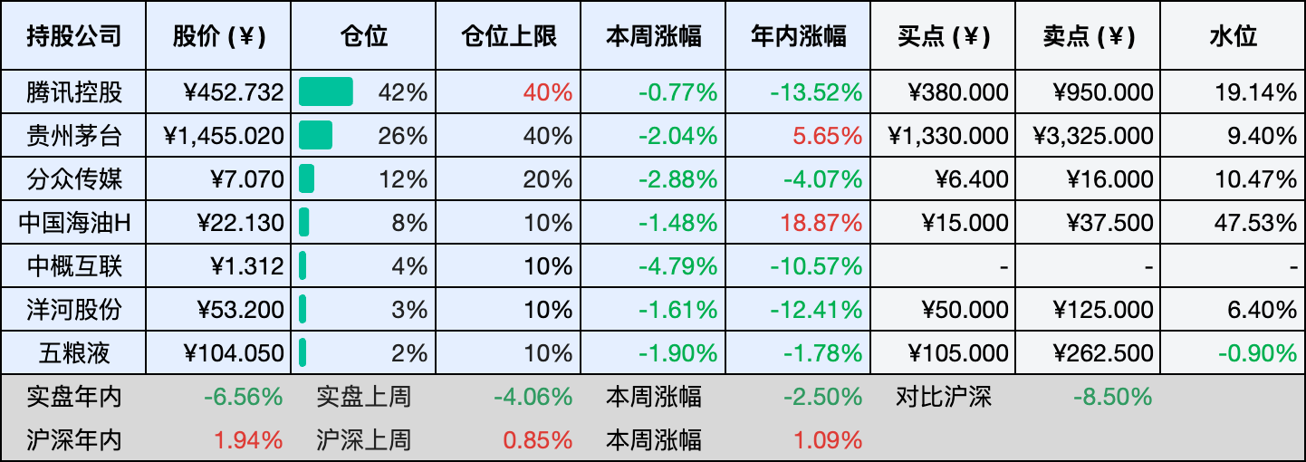 当前持有的股票包括:腾讯控股 43%、贵州茅台 25%、分众传媒 12%、中国海油H 8%、中概互联 4%、洋河股份 3%、五粮液 2%。