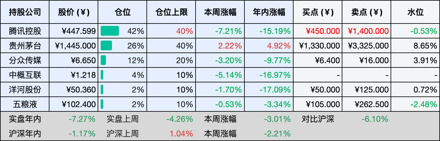 当前持有的股票包括:腾讯控股 42%、贵州茅台 26%、分众传媒 12%、中概互联 4%、洋河股份 3%、五粮液 2%。